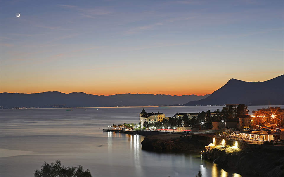 A couple enjoys the sunset on the waterfront of Loutra Aidipsou in front of the hotel Thermae Sylla Spa.
