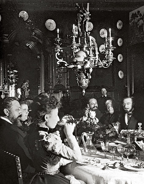 At the Zollikofer residence in Nancy, circa 1901. Nissim and his friends and other banqueters enjoy a lavish dinner and amuse themselves with poems, music and wide-ranging conversations.