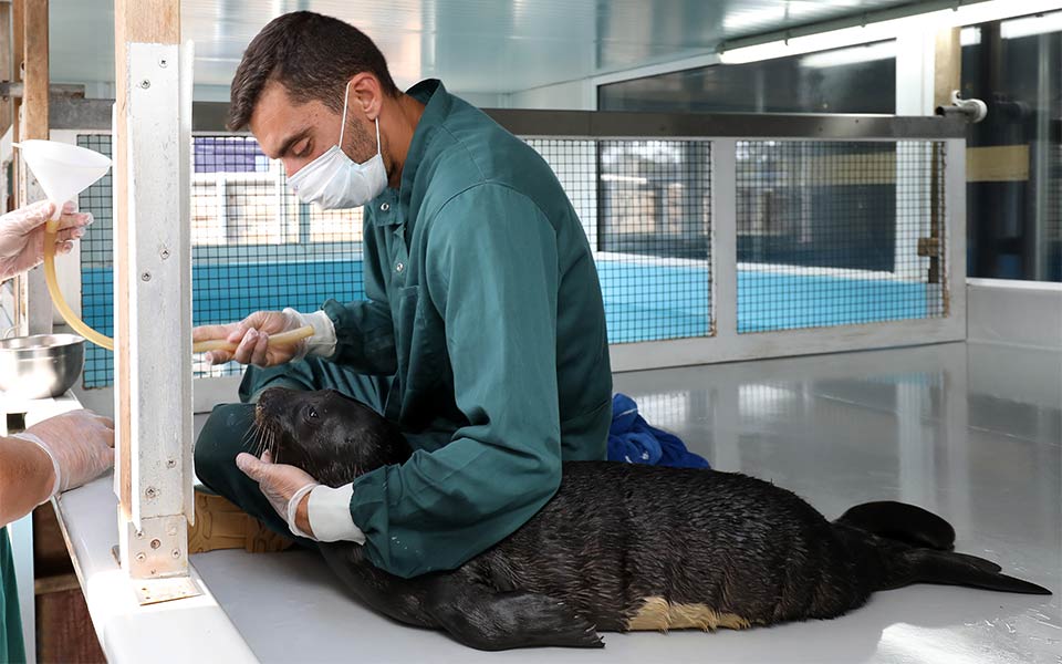 Kostis the seal is fed pureed fish at the nonprofit MOm