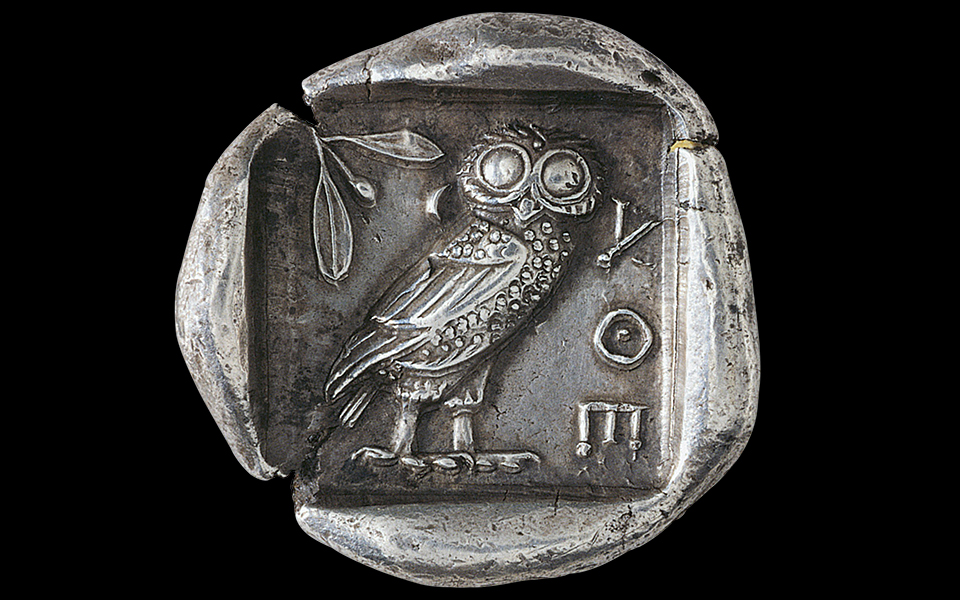 The coin was known colloquially as a glaux (little owl), and was the reserve currency of the ancient world. The current one-euro coins minted in Greece bear the same motif of the glaux as the ancient Athenian coin. The owl’s association with money is also where the ancient expression “owls to Athens” is thought to originate: like the English equivalents, “coals to Newcastle” or “ice to the Eskimos,” it means “to offer someone what they have in abundance” and is shorthand for a pointless gesture, or a statement of the obvious.