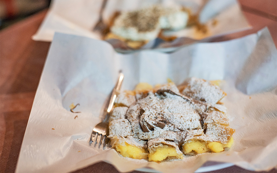 The north of Greece is famous for its excellent filo pastries, and queen among them is the bougatsa – layers of flaky dough with fillings of cream, spinach, cheese, or seasoned chopped meat, hacked into bite-sized pieces.