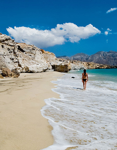 This island was created over eons by successive underwater volcano eruptions, and its magnificent rock formations will stay etched in your memory as the backdrop of the excursions you make here. People visit for the beaches. Each one more incredible than the last, they are characterized by moon-like landscapes, tall rock pillars that rise from the shallow turquoise water, and coves that were once the lairs of pirates. There are spots where the sea becomes a natural jacuzzi, with warm gases bubbling up from the seabed. Elsewhere, the sand is so hot that it is impossible to walk barefoot. Make sure you visit one of the villages featuring the famous “syrmata” – colorful boathouses dug out of the rock where fishermen traditionally stored their boats in the winter. Many of these have today been converted into unique holiday homes, some of which are available for rent.