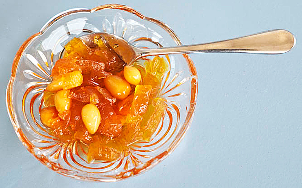 Traditional island sweets made by preserving fruit in syrup are usually offered to visitors