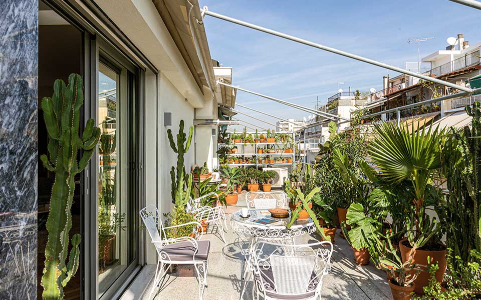 The jewelry designer Ileana Makri has a balcony that puts the Acropolis almost within touch, and she says that this space is, in effect, the heart of her house: “I care for and attend to it as much as the interior of my apartment. I don’t need to do much regarding its atmosphere; the view of the Parthenon does all the work. I only added a table and a cactus I brought from Ecuador – the cactus because, as shamans believe, they create a protective zone.” Similarly, the creative director of G Design Studio, Michalis Georgiou, who lives in a renovated apartment in Exarchia, says that the central part of his life at home is shaped on his balcony: “Every morning before work, I spend two hours caring for the plants and drinking tea. This two-hour period is my decompression time and the source of my own positive energy.