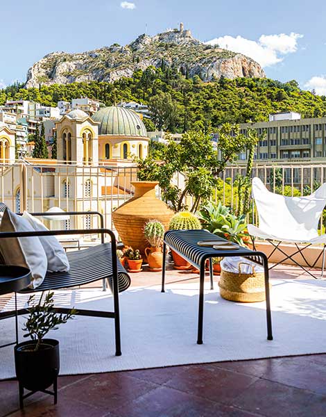 The roof garden of an apartment in the Acropolis area, a stone’s throw from the Parthenon.