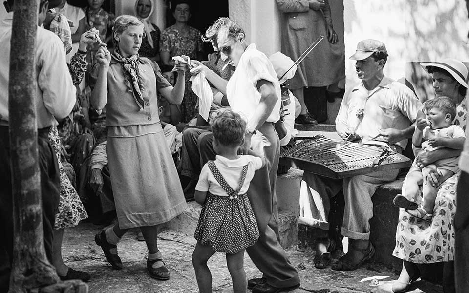Dancing at Aghios Panteleimon Monastery in Mykonos at a baptism on the saint’s feast day in 1955. The woman dancing is Argyro Kypraiou.