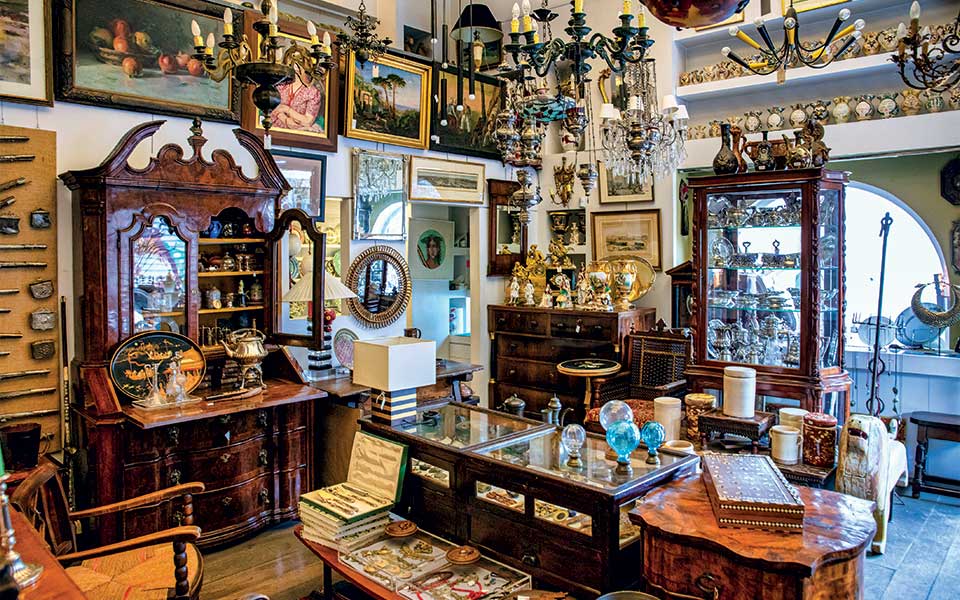 Period furniture, silver pistols, porcelain, glassware and Italian modernist chandeliers in one of the oldest antique shops in Athens.