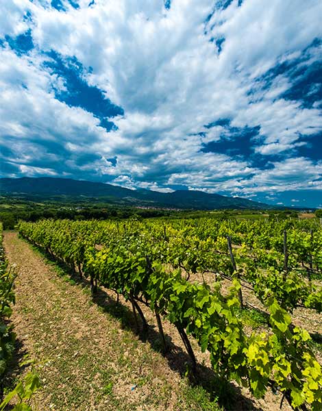 The loamy hillsides southwest of Drama, rich in clay and silt, are home to the organic vineyards of the Charalaboglou family. They grow a range of grapes – nine Greek varieties (Assyrtiko, Malagouzia, Malvasia Aromatica, Rhoditis and Vidiano are for the whites, and Agiorgitiko, Koiniariko, Mavrotragano, and Mavroudi are for the reds) and eight international favorites. Wildflowers and other native plants share the sloping vineyards; the symbiotic ecosystem enriches the soil with organic matter, while the natural competition for resources encourages the vines to develop a hearty root system. The vines are watered only with whatever flows beneath the soil, down the slopes or from the sky.