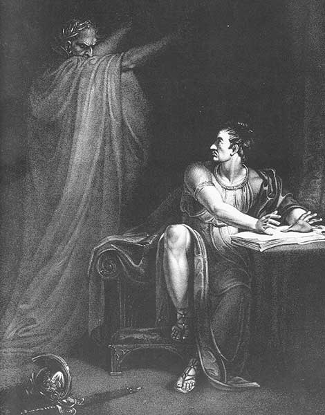 Brutus and the Ghost of Caesar (1802), copperplate engraving by Edward Scriven from a painting by Richard Westall, illustrating Act IV, Scene III, from Shakespeare's Julius Caesar.