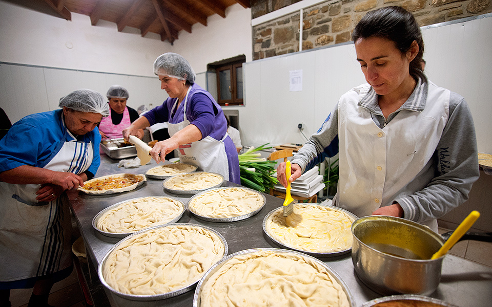 Members of the women's cooperative of Dipotamia village preparing traditional pies