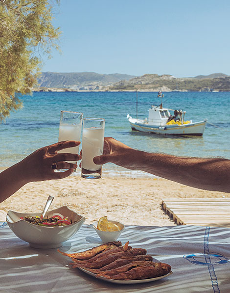 Kalamitsi Taverna has just ten tables spread out on the sand, the best way to dine in summer. “We don’t want anything to change here – isn’t this why you all love us?” asks Dimitris Ventouris, who opened this small taverna some 20 years ago. His son, Stelios, has now taken it over, but he, too, has no plans to change the restaurant’s traditions.
