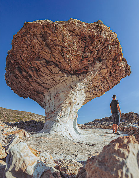 The most famous geological formation on Kimolos is called Skiadi; it’s a mushroom-shaped rock composed of 70 different kinds of rock. Pay a visit in the golden light of late afternoon after a beautiful 30-minute hike. In addition to the lovely view over the hills and sea, you will pass dry stone walls, olive groves (Kimolos also produces olive oil), and a traditional stone farmhouse with a threshing floor. The footpath for Skiadi is accessible from Horio, but you’ll have to ask locals where it begins. It’s the only one that is well signposted once you’ve found it. Still, it’s a good idea to download a map from the website kimolos.gr.