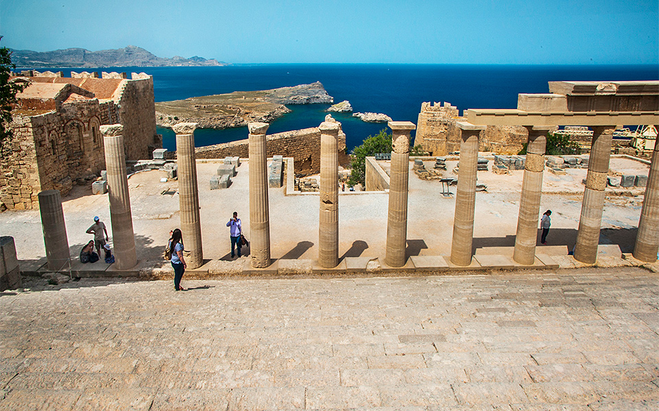 Along the ascending road, peddlers display woven tablecloths spread here and there on the ground. Visitors enter the castle through a gate built by the Knights of St. John (erected on top of a Byzantine fortification) and climb a lengthy staircase. Traces from every era reinforce just how strategic this place was through the ages: remnants of the Hellenistic-era sanctuary share the acropolis with Early Christian chapels and Byzantine churches.
