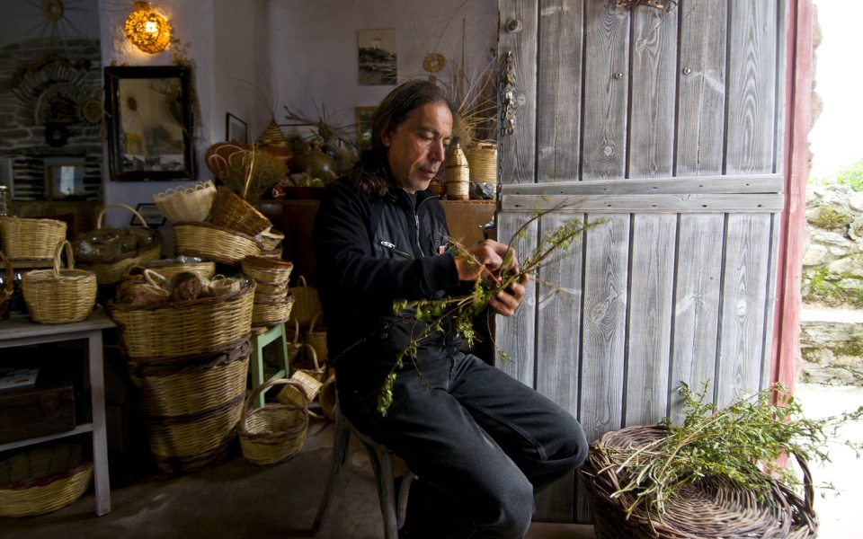 The first thing that caught my eye as I approached Volax on the island of Tinos were the legendary boulders that surround the village and seem to have come from another world. As I began walking through the village’s small streets. I couldn't put my camera down. I was snapping away non-stop when I found myself in front of a basket weaver's workshop. Iosif Vidos was sitting outside, quietly weaving a basket. I envied him for being able to work in such a relaxed way. He welcomed me with a coffee and showed me how he begins to make a basket, which thin branches he uses and how freshly cut they should be. As I watched him work, I thought about how vital baskets were for people in the time before electricity, cars, or televisions, when paper or plastic bags did not exist. Watching his easy hand movements and his relaxed demeanor, I also reflected on how contagious his calm attitude towards life could be. After all, there's something that's soothing about weaving a basket, whether you're making it for practical or, as is more likely these days, for decorative purposes.