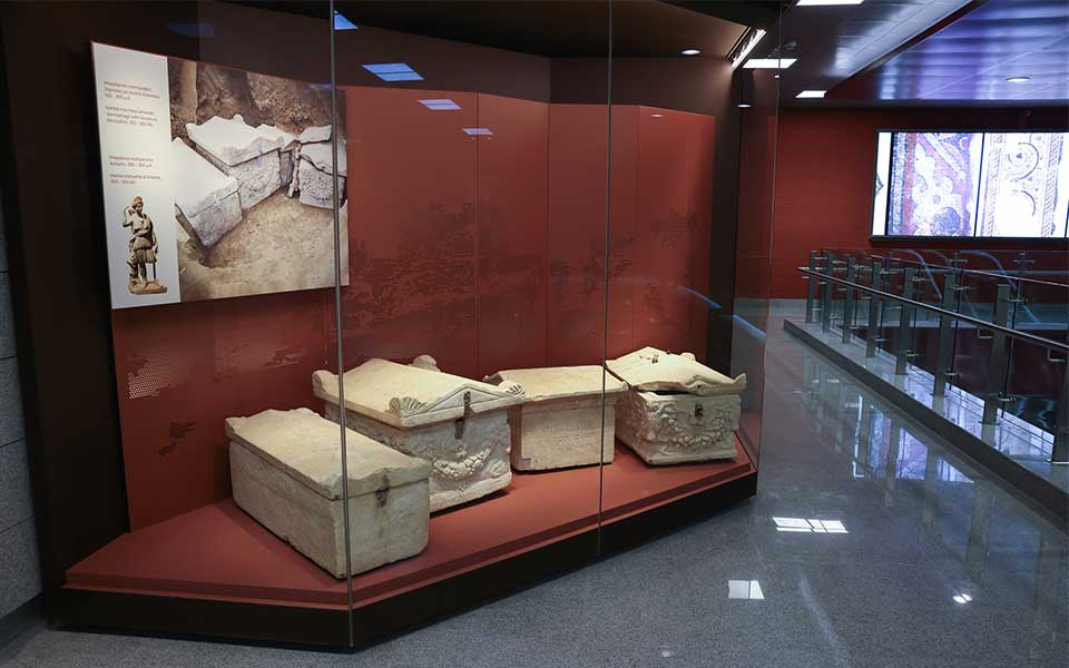 At Syntrivani Station, fragments of mosaic floors and wall paintings from a cemetery basilica (400–500 AD), alongside four intricately sculpted marble sarcophagi (100–300 AD), offer a glimpse into the opulent tombs of the eastern cemetery during the Hellenistic and Roman periods. These exhibits also shed light on the Christianization of the necropolis, marked by the construction of a worship site later replaced by a three-aisle basilica.