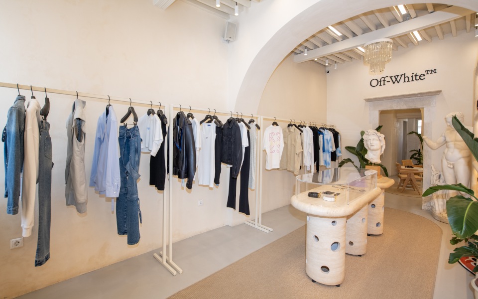 Off-White’s Mykonos boutique holds the distinction of being the first store opened by the brand in Europe. Located at 18 Kalogera Street, the Off-White store in Mykonos seamlessly integrates the urban aesthetics of Virgil Abloh’s designs with the laid-back, bohemian vibes of the island. The opening of the store, which was designed by Virgil Abloh himself, marked a significant milestone for the brand. The store’s interior reflects the island’s serene beauty, with a color palette inspired by the blue, green, and white hues of the Aegean Sea. The décor, featuring Greek statues and minimalist furniture, creates a unique shopping atmosphere that balances modernity with classical elements.