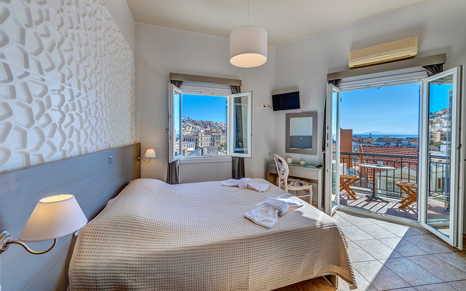 Housed in an 18th-century building in the center of Ermoupoli, the hotel has double rooms and apartments with great views. Double rooms at 60-70 euros.