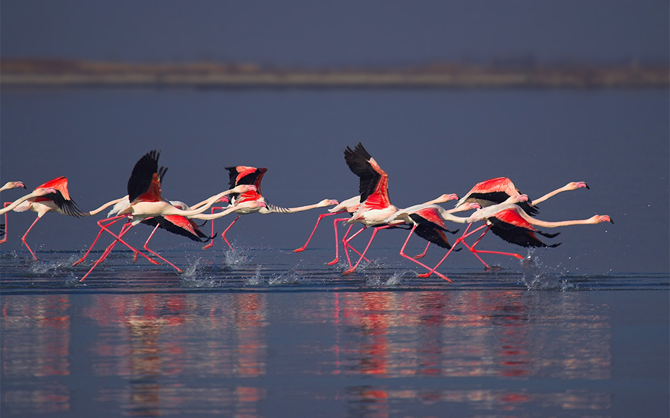 Flamingos taking flight from a lagoon near the Loudias Estuary