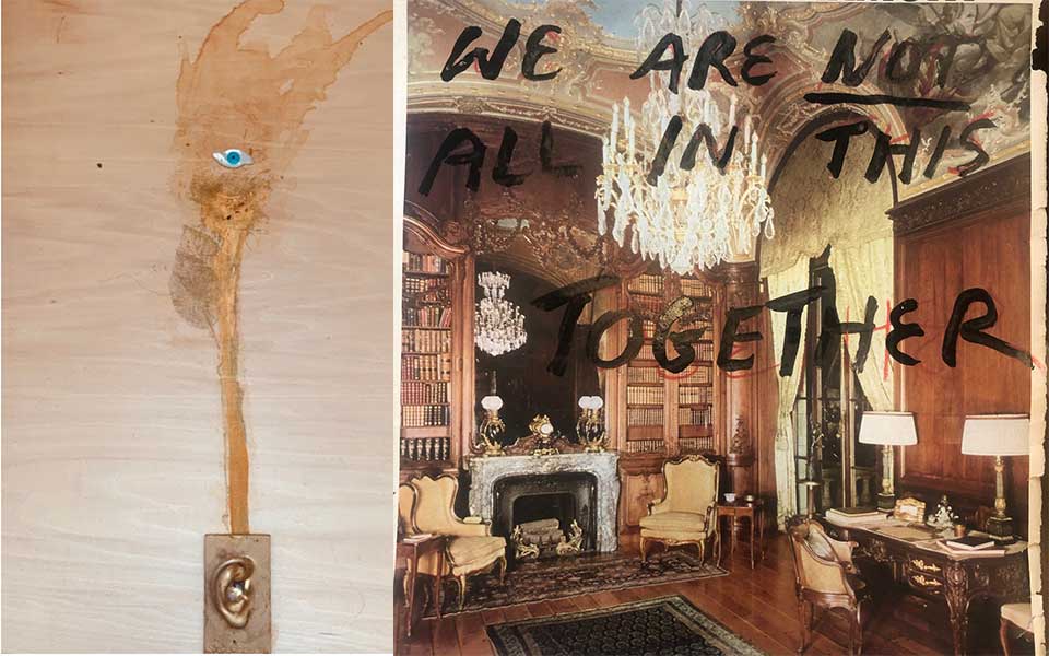 Chrysanne Stathakos “Form is emptiness emptiness is form, 2020 (left) and Karen Finley “We are not all in this together”, 2020 (right)