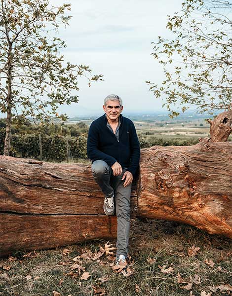 Winemaker Stellios Boutaris sitting on the Fallen Oak, a landmark on the Kir-Yianni Estate.