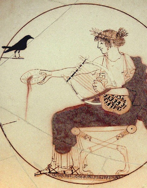 Apollo wearing a laurel/myrtle wreath, holding a kithara and pouring a libation. White ground kylix, ca. 480-470 BC. On display at the Delphi Archaeological Museum.
