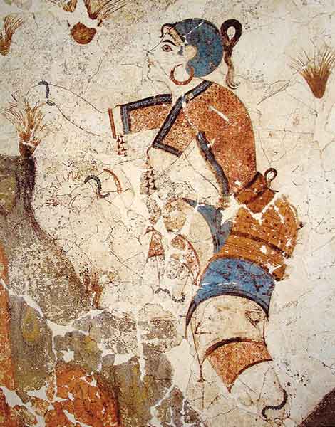 The famous "Saffron Gatherer" fresco from Akrotiri, Thera, ca. mid-second millennium BC.