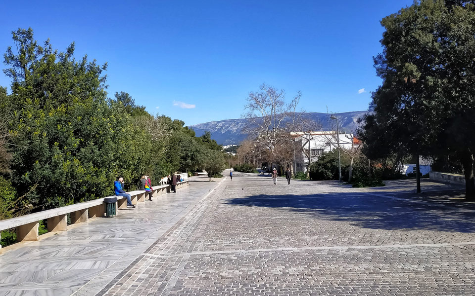 The normally bustling pedestrianized Dionysiou Areopagitou underneath the Acropolis