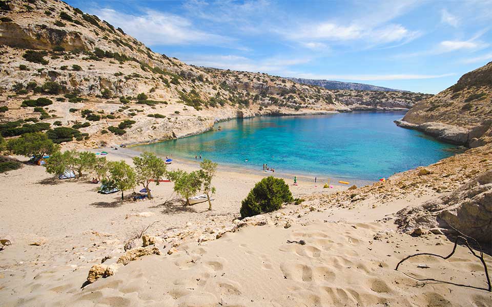 The southern side of Irakleio, under the Asterousia mountain range, is dotted with many – secluded and non-secluded – beaches, including Agiofaraggo, which has become particularly popular, and Tripiti Beach, with its many recreational vehicles. If you want to escape the crowds, Vathi Beach is a perfect alternative. A sandy beach with crystal clear waters and a few tamarix trees that provide shade from the midday sun, Vathi lies at the end of a 10-km dirt road.