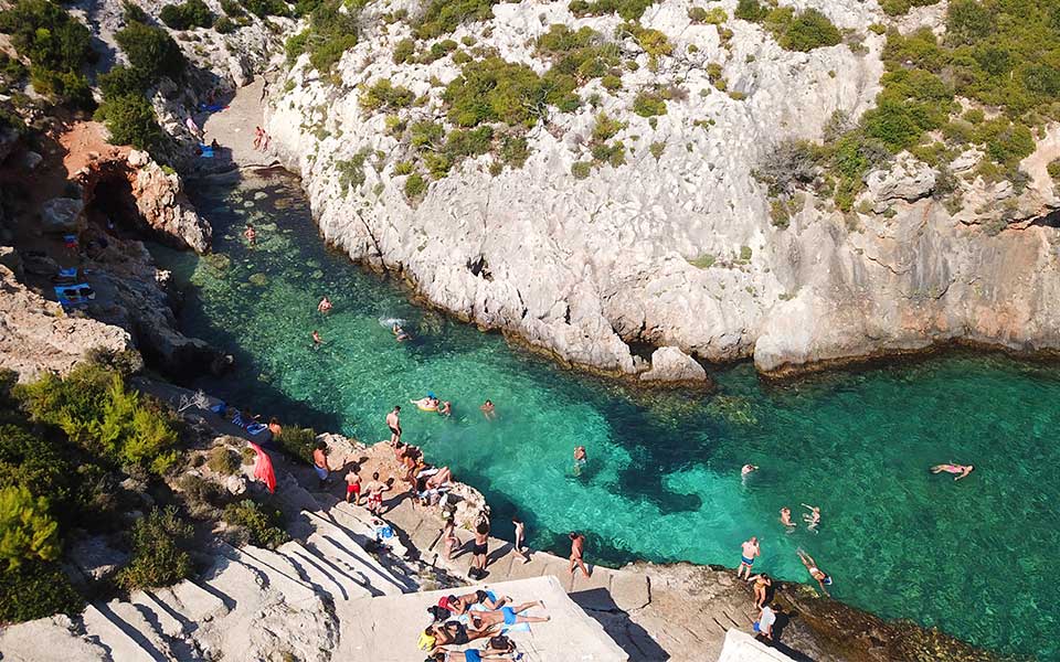 Forget the extremely dangerous Shipwreck (Navagio) Beach and dive into the crystal-clear waters of the hidden fjord-beaches in the northwest instead. The most well-known is Limnionas, which attracts crowds, but every swim is worth it, and you can also enjoy well-prepared dishes at the nearby taverna Porto Limnionas (Tel. (+30) 26957.720.72). The small beach of Stenitis will take your breath away, nestled in a narrow fjord on the sea route from Porto Vromi to Navagio. Emerald waters, rocks all around, and a tiny sandy beach in the background. Stenitis is accessible by car from the village of Maries, though a sturdy vehicle is required.