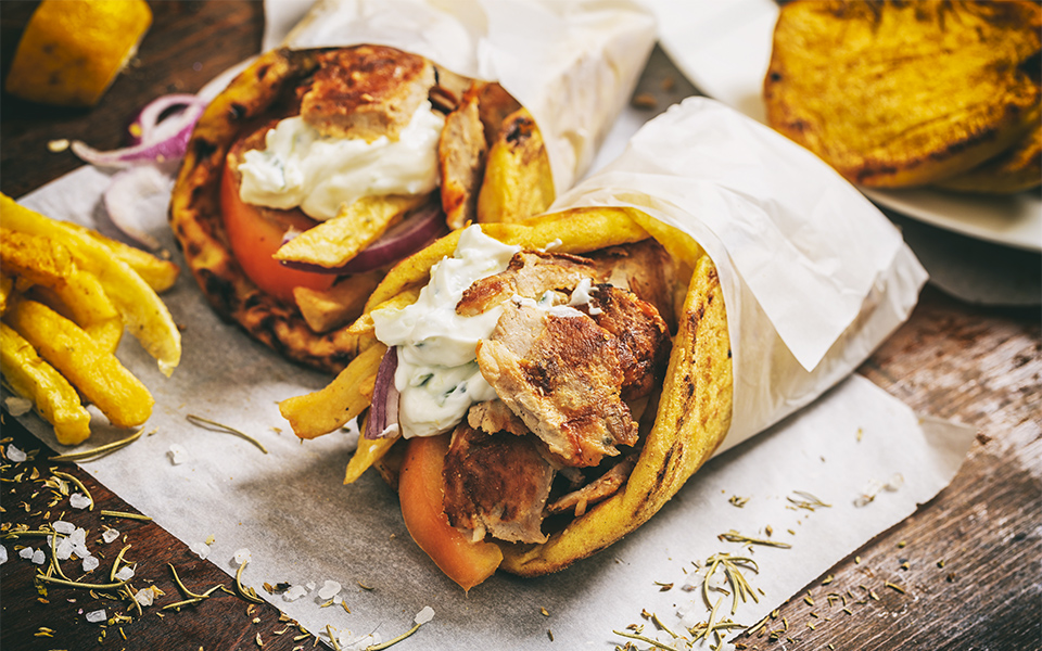 The gyro wraps in Thessaloniki are customarily packed to the gills with savory goodness.