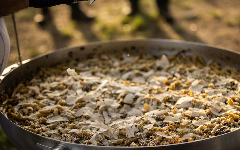 Our own hunt ends in success. After several truffles have been unearthed and Benfra seems satisfied that she has found everything viable in the vicinity, everyone heads to a clearing in the woods. Alexandros cleans the fungi under flowing water with a toothbrush as Benfra looks on, then makes her way through our group, getting lots of much-deserved attention from everyone. Meanwhile, Alexandra Niavi, chef of the Natural History Museum of Meteora and Mushroom Museum, starts to cook. We are having pasta with fresh and dried mushrooms – the museum shop’s own products – cooked in the stock from the mushrooms and finished with shavings of the fresh truffles. People take turns stirring. When the pasta is done, Niavi adds a whole bottle of white truffle oil. Even in the wide open space, a heady odor fills the air. Then she shaves the truffles that Benfra has just found over the dish for another earthy burst of aroma. The team serves it up in biodegradable dishes of dried leaves, and we dig in with wooden forks.
