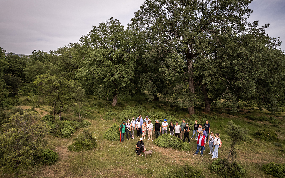 Throughout truffle-hunting season, the museum offers a very special experience, the same one that we are taking part in now. Everyone drives to a wooded spot some 20 minutes from town. Benfra, Lara, or one or more of their other canine colleagues, accompanied by Alexandros or Argyris, leads the way. Sturdy shoes and long pants are a good idea, because you’ll be tramping through the shrubland behind them at a good pace.