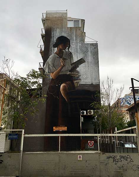 I start my walk from the corner of Megalou Alexandrou and Kolonou streets, where my gaze lifts upwards, to take in the street artist SimpleG’s impressive mural that covers the entire side wall of an apartment building and depicts a girl reading.