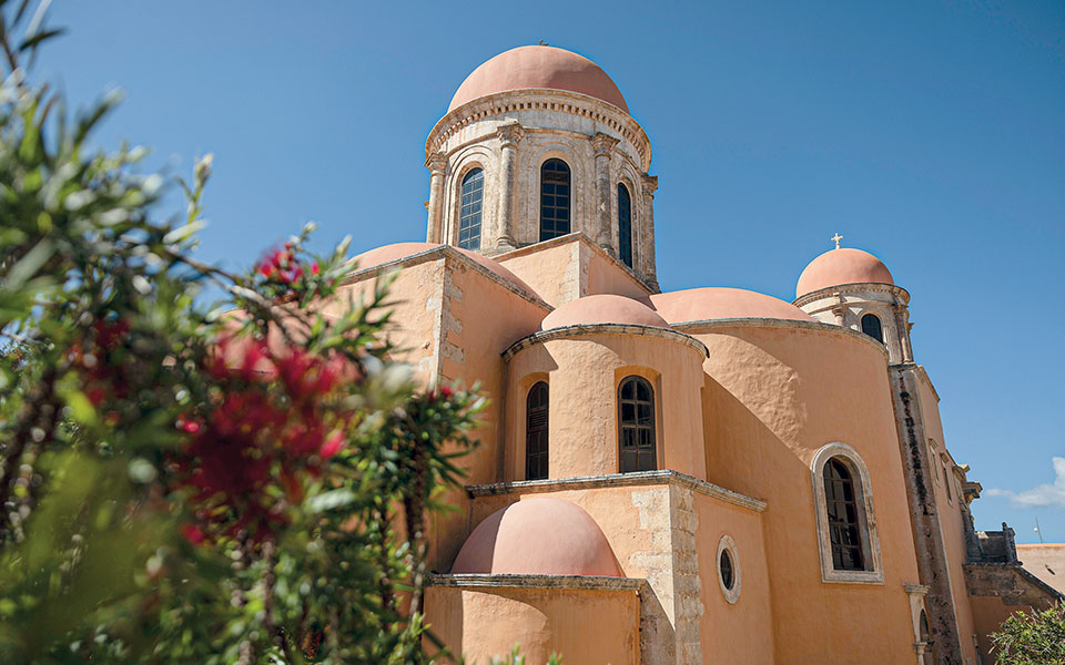 Founded in the early 17th century by brothers Ieremias and Lavrentios of the Venetian Tsangarolon family, which had embraced Orthodoxy, the monastery, which served as an architectural model for others across the island, boasts a katholikon, or main church, of the Athonite type, an architectural layout first developed on Mt Athos; the rest of the complex represents a textbook example of Mannerism (the transitional style from Renaissance to Baroque), inspired by designs attributed to architect Sebastiano Serlio. Perfect symmetry, a structure that is two stories high inside but three outside (owing to the terrain), a monumental staircase, an ornate arched gateway, an elevated courtyard and many other details all evoke the Cretan Renaissance. Vaulted spaces house the ossuary, the old olive press, the cellar and a cistern, and there is an ecclesiastical museum, too, which features icons by the Hania painter Emmanouil Skordylis, as well as sacred relics, manuscripts and vestments. Yet the complex’s most striking feature of all is perhaps the bitter orange tree (Citrus aurantium) in the main courtyard, said to have been planted by the monastery’s founders themselves in 1606.