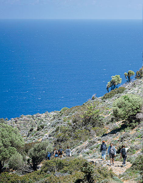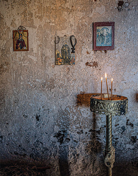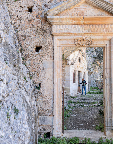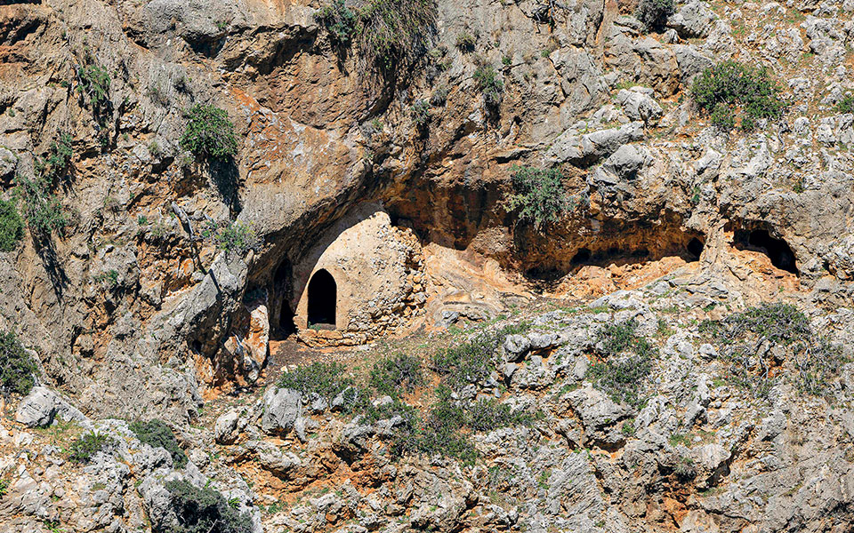 A cobbled path, flanked by rocks, thorny shrubs, spiny bushes and the occasional solitary tree, winds through the gorge and descends toward the sea. Many visitors, Greek and foreigners alike, come here, drawn to a place that witnessed a succession of faith from pagan to Christian – locals come here, too, some for the same reason, and others merely to gather salt or wild greens.