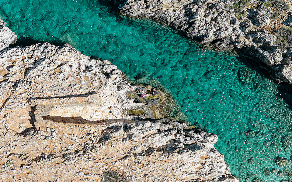 For the next fifteen minutes, as you walk the floor of the gorge, you might find yourself musing over nature, architecture and spirituality, but when you finally reach the rocky coastline and the stunning little fjord that awaits you there, it will undoubtedly be a swim in its crystal-clear waters that you’ll be thinking about. Nonetheless, history and legend are present even here; the ruined structure near the shore once sheltered the monks’ boat, while nearby lies a quarry from which building stone for the monasteries was extracted. A jagged rock formation facing you out at sea is said to have once been a pirate ship, turned to stone by Aghios Ioannis the Hermit himself when an abbot cursed it in that saint’s name.