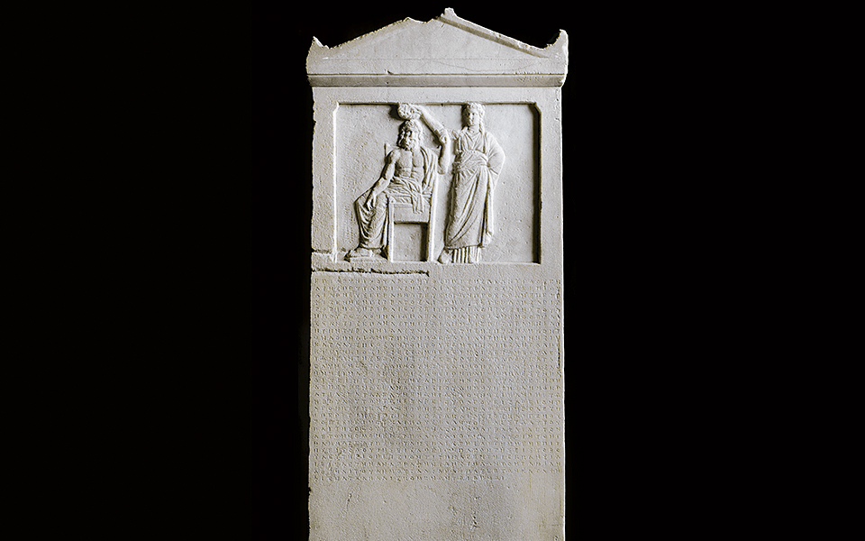 Democracy (personified) crowning an enthroned Demos. The law against tyranny, voted by the Assembly in 337-336 BC, can be found inscribed on the main part of the stele (Museum of the Ancient Agora, Athens).