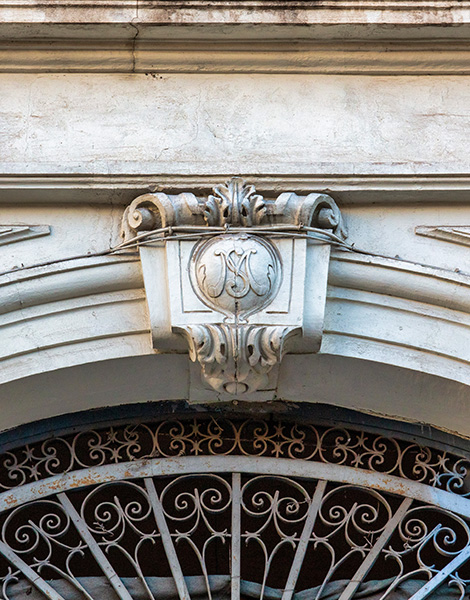 The mansion was commissioned by the affluent Sephardic Jewish family of Alberto and Allegra Ergas. On the upper floor, within an oval medallion framed by ornate plaster garlands, one can still read the family’s name. Another subtle tribute survives at the main entrance on Dionysiou Solomou Street: the intertwined letters A and E – the initials of the original owners – can be seen on the wrought-iron door, silent relics of a cosmopolitan world long vanished.