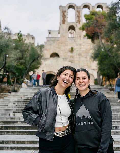 As the breakfast area empties, Sissilia adds the last mini croissant to her plate. “It always depends on the kind of trip you want to have,” she says, explaining her decision to stay here. “Often, when you book a trip last minute, you don’t want to blow your budget on accommodation, but you still want some sort of guarantee that you’ll have fun. And that’s usually true with hostels. Just imagine: last night Eleonora and I arrived knowing absolutely no one, and now, this morning, we’ve already made a new friend over breakfast,” she says, gesturing at David. We head up to their room, and once they’re ready, we set off for the Acropolis. “I love the contrasts in this city. I mean, on one side of the street you have the Acropolis and right across from it you have this incredibly modern building,” she says, pointing to the Acropolis Museum, before the two continue toward the ancient site.