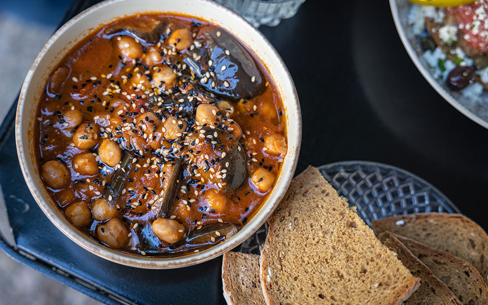 Standout dishes include roast potatoes with PDO xygalo cheese from Sitia, Cretan mizithropita with xynomyzithra from Rethymno, and fried eggs topped with a rich béchamel made from stakovoutyro (clarified sheep butter), a dish that’s flavorsome and ideal for bread-dipping. Apaki and vinegar-cured sausages from Crete are available, too, as is a refreshing summer salad of bulgur with homemade peach dressing, cucumbers, tomatoes, fresh peach slices and pumpkin seeds.