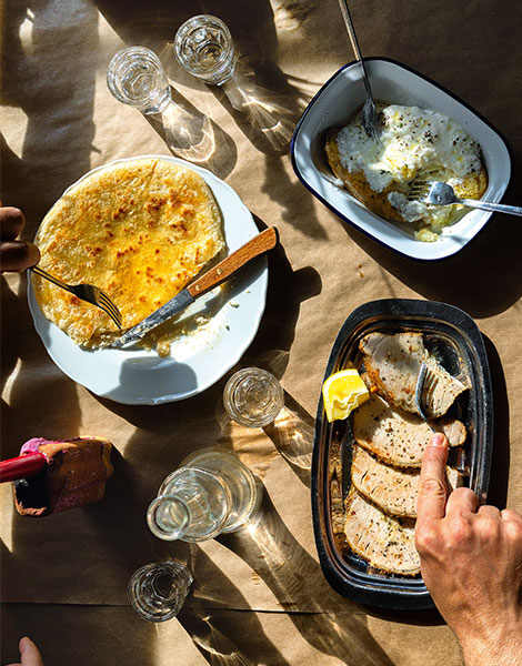 We continue toward Akadimia Platonos and arrive at Mouries (15 Keratsiniou, Metaxourgeio, Tel. (+30) 210.522.6805), a family-run taverna named after the mulberry trees that have shaded this corner for decades. “Even when it hits 40 degrees in Athens, there’s always a breeze under here,” says owner Giorgos. Originally a neighborhood café, the place has since evolved into a proper meze spot. In the kitchen, Stella and her daughter Eirini prepare crisp hand-cut fries; fried meatballs; fresh anchovies and whitebait from the fish market; and warm Sfakian pies with myzithra and honey. Groups of locals sip tsipouro at tables set out on the asphalt beneath a lush canopy of leaves.