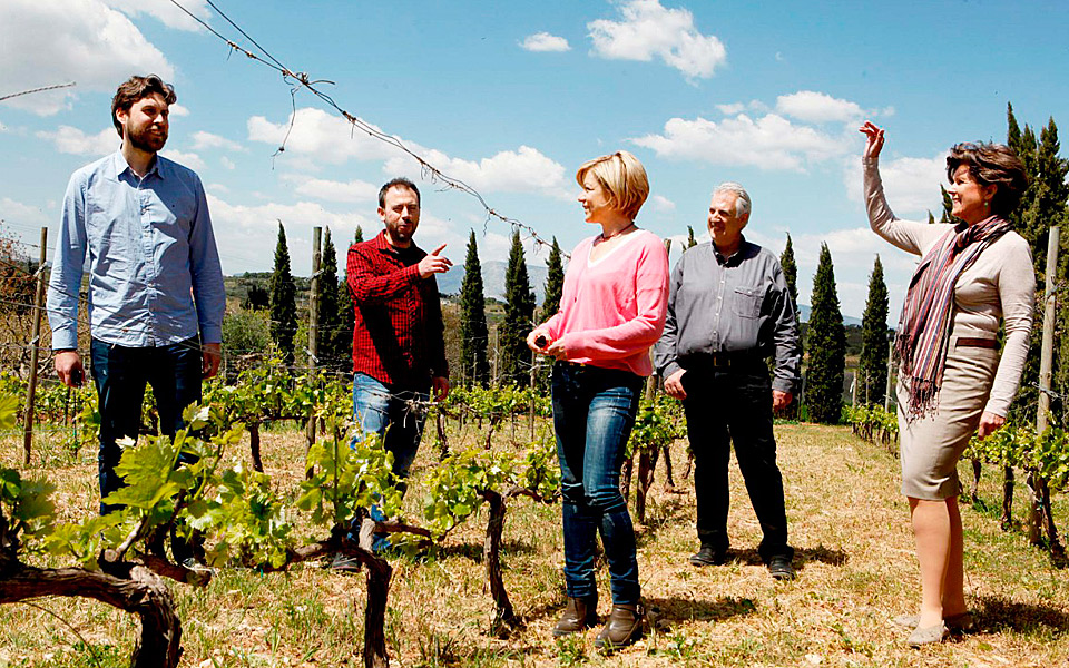 Winemakers promoting the Savvatiano variety at the Papagiannakos vineyard in Markopoulo, Attica