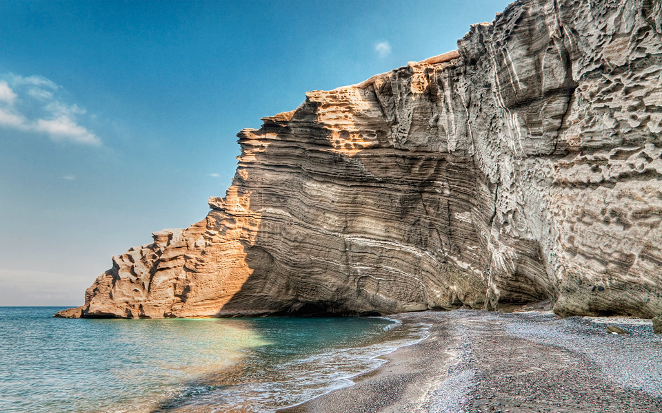 Mesa PIigadia (south-west): Miniature version of the famous Vlychada, with small white pebbles and impressive rock formations, which the local fishermen have excavated into shelters for their boats, behind painted wooden doors. Accessible on foot or by boat. A good choice for a relaxing swim when the north winds are blowing. Pori (north-east): A small, secluded beach with dark sand and, more recently, a small fishing harbor, located further along the coast to the south of Koloumbo. The locals love it because it’s quiet and undisturbed. There are also a couple of nice fish tavernas. Vlychada (south): Easy to reach, quite large and with a striking setting. One part is equipped with loungers and has an excellent beach bar, Theros, tel (+30) 6977.222.666, but there is also plenty of space to spread your towel or strip off far from prying eyes. Monolithos (east): A long stretch of sand with shallow waters, a playground and other sports facilities, plus a lifeguard, making it ideal for families. You will find a selection of restaurants and tavernas, along with changing facilities, showers and public restrooms. Perissa (south-east): One of the first seaside areas to feel the tourism boom, a magnet for the young crowd, offering plenty of facilities (accommodation, camping, beach umbrellas, restaurants, bars, watersports, diving center). Blue Flag recipient, with fine black sand. White Beach (south-west): If you do get as far as Red Beach, it is worth paying a visit to its neighbor, a small cove surrounded by high rocks that overlook the beach of black, gray and white sand with large pebbles. There are only a few loungers and umbrellas. You can reach it by caique from the beach to the right of the Akrotiri archaeological site (a short and pleasant boat ride) or on foot (on the road to Faros, follow the sign left to “Kambia” and from there take the footpath).