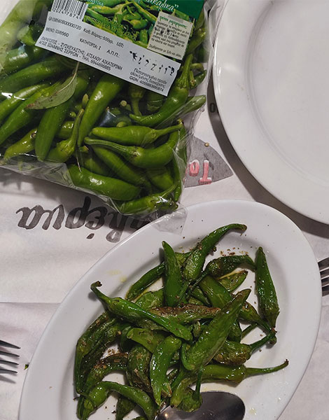 Behind the scenes, a modest electric oven hums away, packed with covered casseroles of local meats. A standout: the lamb shoulder, so tender it slips from the bone. But the dish to order here is the tongue: braised simply with a bit of salt until it’s velvety and rich. Served in thick, unadorned slices, it’s not flashy, but don’t be deterred by the name. This is nose-to-tail dining at its most approachable: pure, delicate meat, with none of the texture issues that might put off the uninitiated. A few vegetarians were at our table, so we snapped up their portions as well. On the side, you get “piperákia bakálika,” small, bright-green local peppers from Serres, similar to Spain’s pimientos de padrón. They’re fried until blistered, then hit with sea salt and a splash of vinegar.