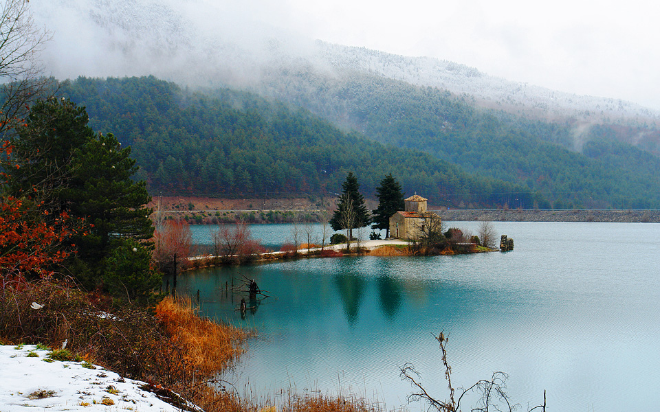 The chapel of Aghios Fanourios on Lake Doxa, in Feneos.