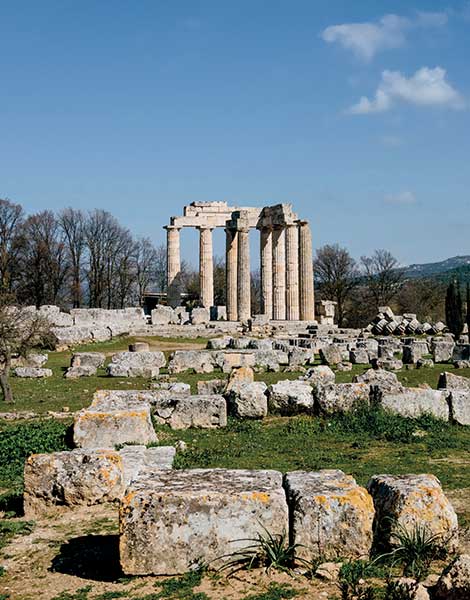 Rising out of the wild grasses and flowers, the eight columns of the Temple of Zeus in Nemea stand tall, still seemingly carrying the weight of divine presence. Lower down, you’ll see the remnants of the cella, the temple’s inner chamber where sacrifices were offered. At the nearby 6th-century stadium, the stone seating and athletes’ entrance remain nearly intact. Unfortunately, the setting lacks adequate interpretive support. Sparse signage and the absence of a narrator or guide meant that we could not fully appreciate what we were seeing. To get a more complete picture, we recommend contacting Elias Papadopoulos, a guide based in Nafplio, who offers organized tours in the area.