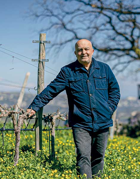 The winemaker Chronis Ieropoulos in his blooming mountain vineyard.