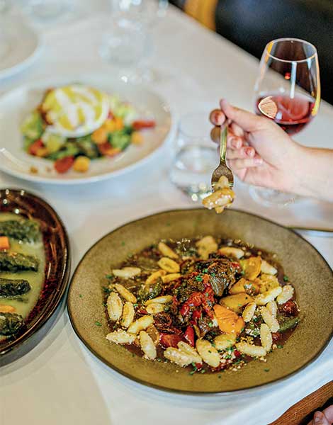No visit to the area is complete without a meal at Sofos. Since the 1950s, when current owner Giorgos’ grandmother Athena ran this taverna, Sofos has been synonymous with good food and wine. Giorgos recalls how Nemea was once remote and isolated, and locals would eat there perforce when going out: mostly traditional dishes such as stuffed grape leaves, baked cod, imam, okra with chicken, and meatballs. When the Nemea–Tripoli road opened, area residents had more options, but Sofos continued to thrive. Giorgos entered the kitchen in 1993, leaving behind a career as a professional soccer player; today, he’s in the front of house while the kitchen is in the experienced hands of his wife Irini Korakas. We enjoyed delicious dolmadakia with lemon sauce and gogkes (a traditional pasta) with beef cheeks, a dish that’s full of flavor. And of course, wine is essential to Sofos’ identity, with wines from all local producers, including rare vintages and magnum bottles for special occasions, as well as house wines starting at just €13 a bottle and €4 a glass.