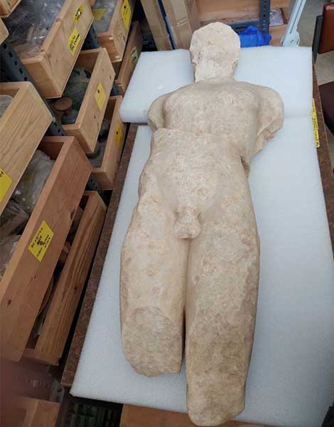 Why were kouroi and fragments found at the same location? “As the faithful visitors of that time ascended towards the entrance of the sanctuary, and at least 500 meters before reaching the temple peribolos (court enclosed by a wall), they admired the dedications placed on pedestals dedicated to the god Apollo on the propylon,” explains the excavator. He adds that during Medieval times, when the Archaic building was demolished, all this wealth of votive offerings was used as building material for other structures.