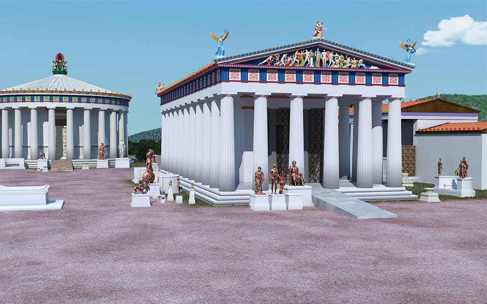 Reconstruction of the 4th century BCE Temple of Asclepius at Epidaurus in foreground, with the ramp extending from the front in the background the thymele, also with its ramp.